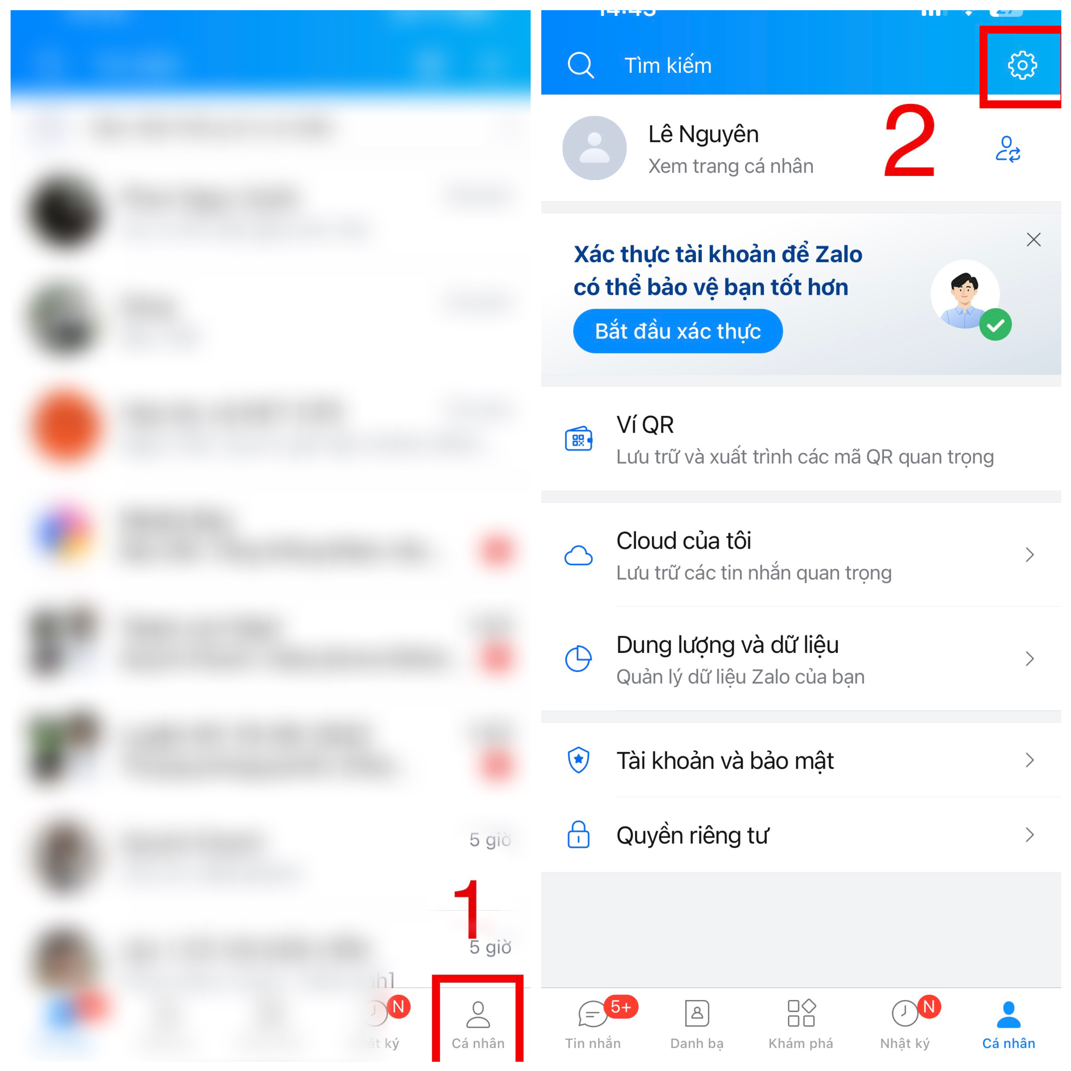 Bước 1: Nhấn vào Zalo => Chọn vào mục Cá nhân ở góc dưới bên trái màn hình => Chọn vào bánh răng để cài đặt.