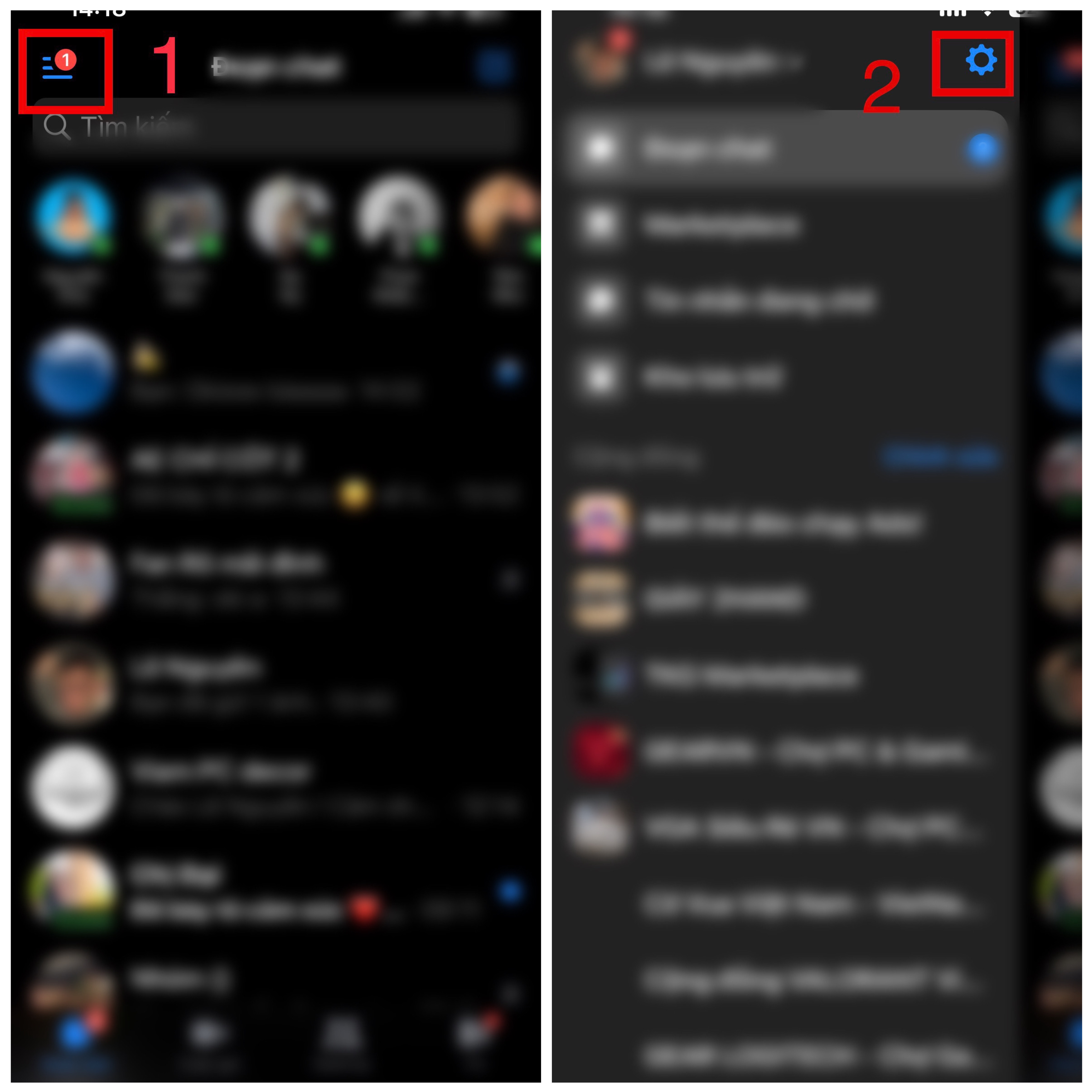 Bước 1: Nhấn vào Messenger => Chọn vào mục 3 kẻ ngang ở góc trái trên cùng và chọn vào biểu tượng bánh răng