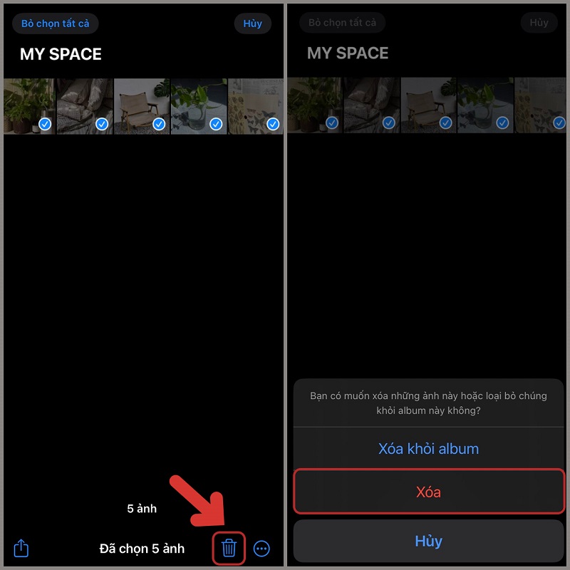 Nhấn chọn biểu tượng rỗng bên dưới để xóa ảnh. Xác nhận xóa bằng cách nhất chọn “Delete number Photos” (Xóa số ảnh).