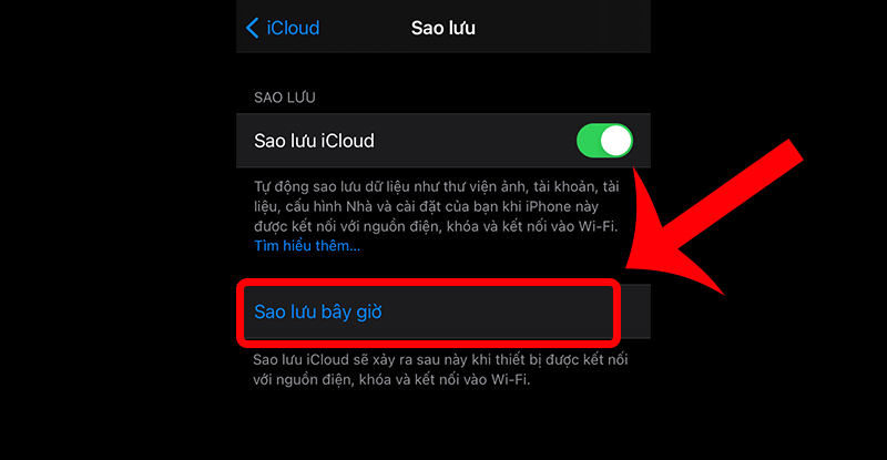 Bước 3: Sau khi đã bật thì bạn hãy nhấn vào mục Sao lưu iCloud => Chọn Sao lưu bây giờ