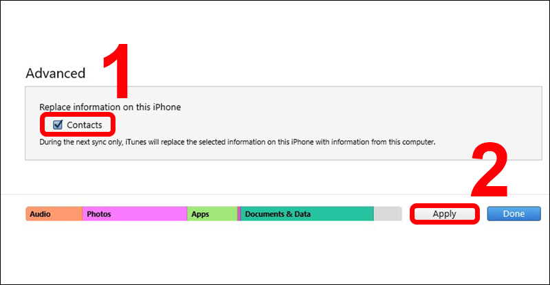 Bước 2: Bạn hãy kéo xuống và tìm mục Advanced sau đó tick vào mục Contacts trong mục Replace information on this iPhone => Chọn Apply