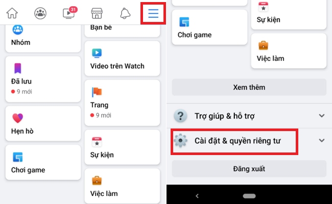 Tại giao diện Facebook : Chọn dấu 3 gạch ngang (Góc bên phải màn hình) => Chọn “Cài đặt và Quyền riêng tư”
