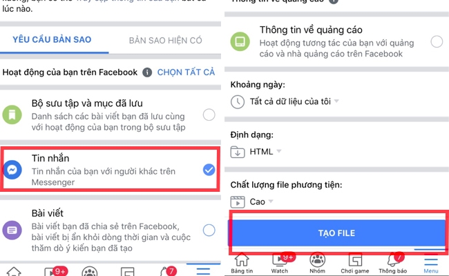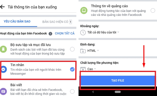 Sau khi đã nhấn vào “Tạo file” thì bạn hãy chờ một chút để hệ thống tạo bản sao tin nhắn sau đó bạn hãy nhấn “Tải xuống” để tải tin nhắn Facebook Messenger