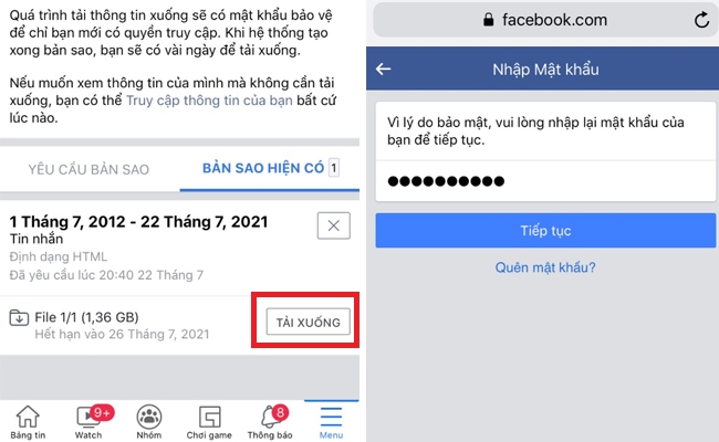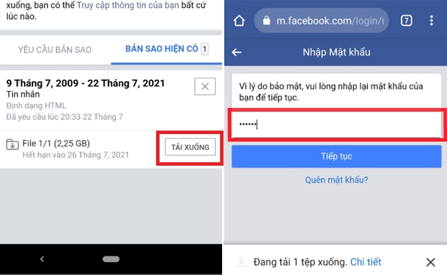 Khi nhấn chọn “Tải xuống”, điện thoại của bạn sẽ tự động chuyển bạn đến trang Facebook. Nhập mật khẩu để tải tin nhắn. Cuối cùng, bạn kiểm tra từ trên xuống để mở file tin nhắn vừa tải là bạn đã có thể khôi phục tin nhắn đã xóa trên messenger rồi đấy.