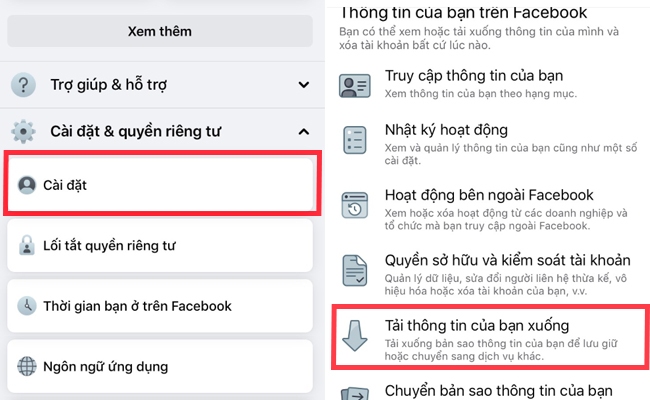 Tại mục “Cài đặt và Quyền riêng tư” => Chọn “Cài đặt” => Chọn “Tải thông tin của bạn xuống”.