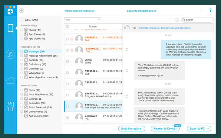 Tại đây, tin nhắn đã bị xóa khỏi thiết bị có màu đỏ, bạn chỉ cần chọn vào những mục tin nhắn cần khôi phục và nhấn Recover hoặc Export.