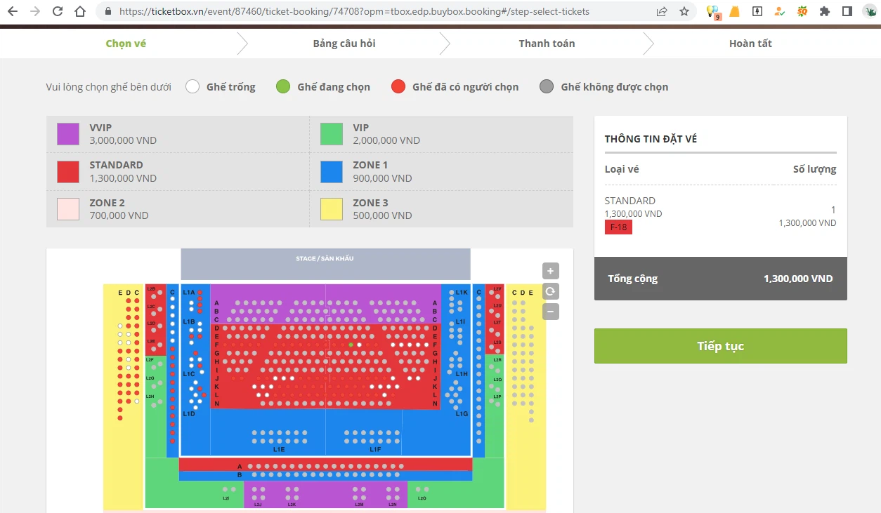 Sau khi đã chọn được vé thì bạn sẽ được đưa tới giao diện đặt chỗ, nếu bạn đã đến được đây thì coi như là bạn đã gần đến với thành công, tại đây bạn sẽ thấy được sơ đồ sân khấu, các khu vực sẽ được phân chia màu khác nhau tương ứng với những mức giá khác nhau. Hãy chọn cho mình một vị trí thật đẹp và phù hợp với mình nhé! Sau đó nhấn Tiếp tục để qua bước 6.