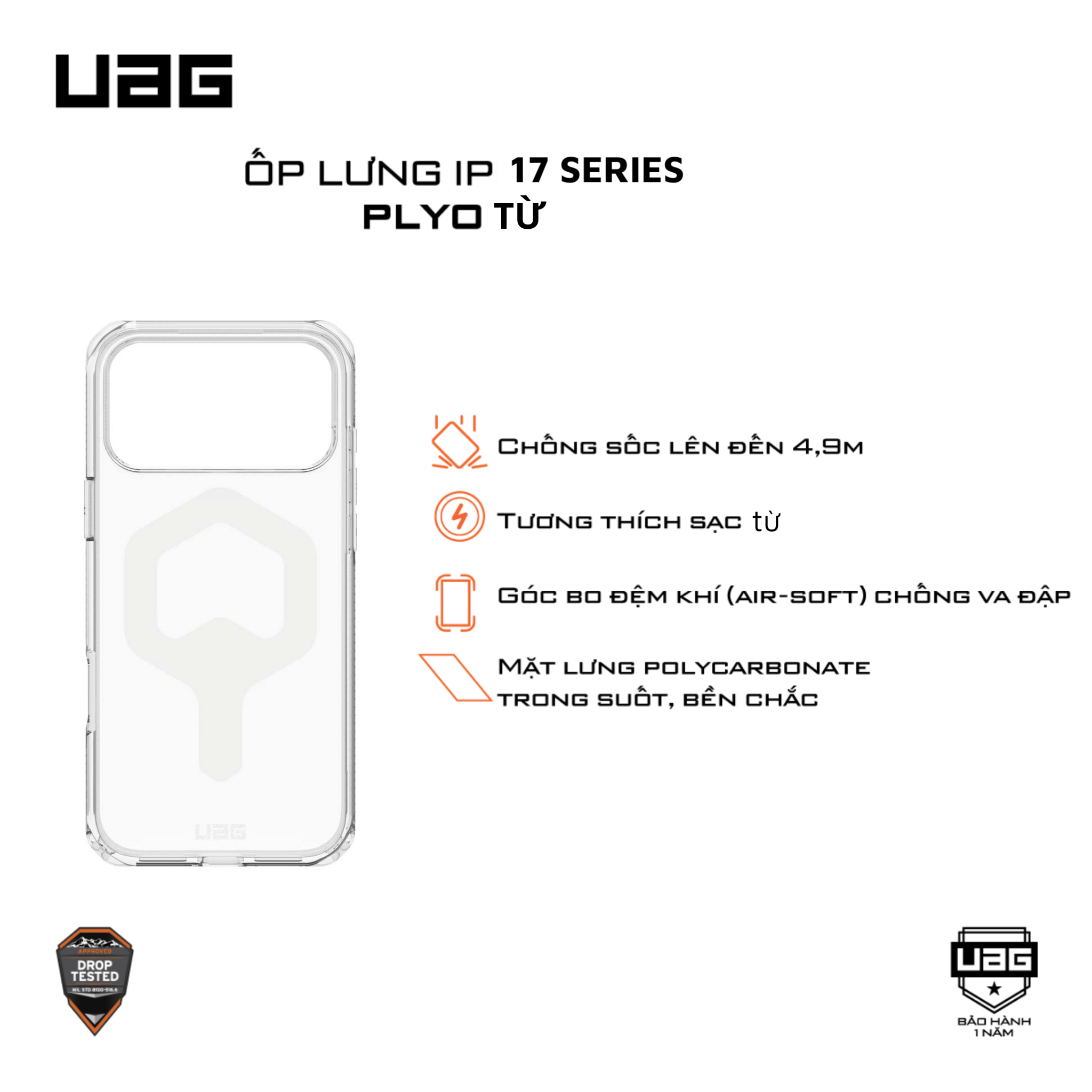 UAG Plyo Exclusive cho iPhone 17 Series là lựa chọn hoàn hảo cho những ai yêu thích sự tối giản và nguyên bản, nhưng vẫn cần khả năng bảo vệ vượt trội chuẩn quân đội. Với thiết kế trong suốt, chống sốc ấn tượng và khả năng tương thích MagSafe, sản phẩm mang đến sự cân bằng giữa thẩm mỹ, an toàn và tiện ích hiện đại.