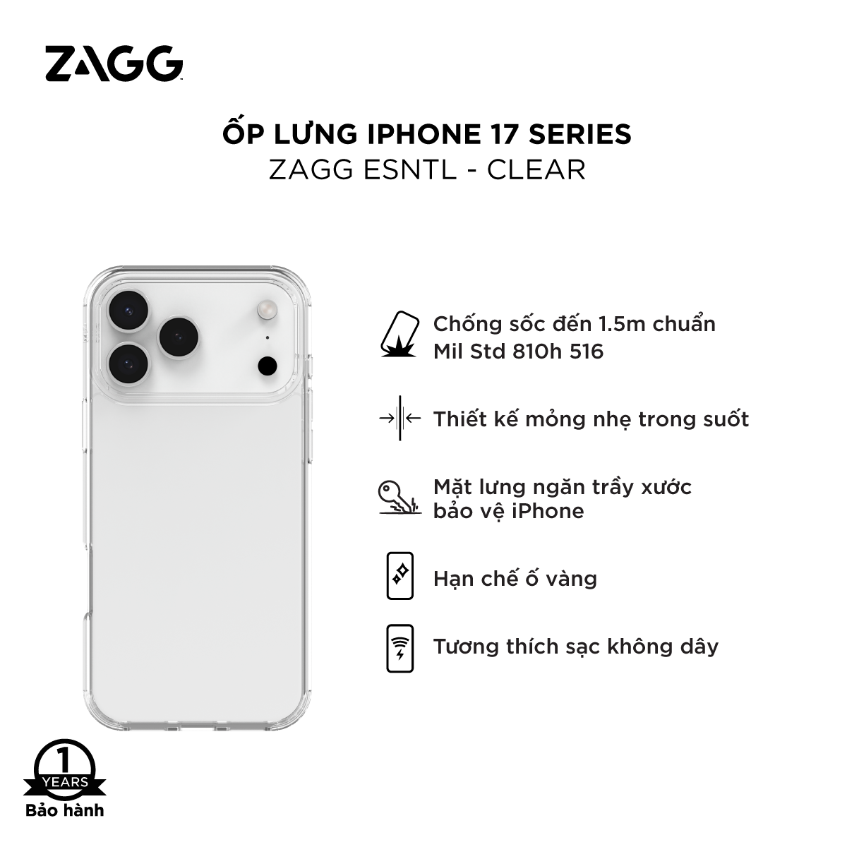 Ốp lưng ZAGG ESNTL Clear thiết kế trong suốt, giữ được vẻ đẹp nguyên bản của iPhone 17 Series mà vẫn bảo vệ toàn diện, đồng thời ốp lưng còn trang bị khả năng chống sốc tốt giúp giảm nguy cơ hư hỏng máy. Hãy cùng tìm hiểu thêm thông tin về các tính năng và khả năng bảo vệ của sản phẩm này nhé!