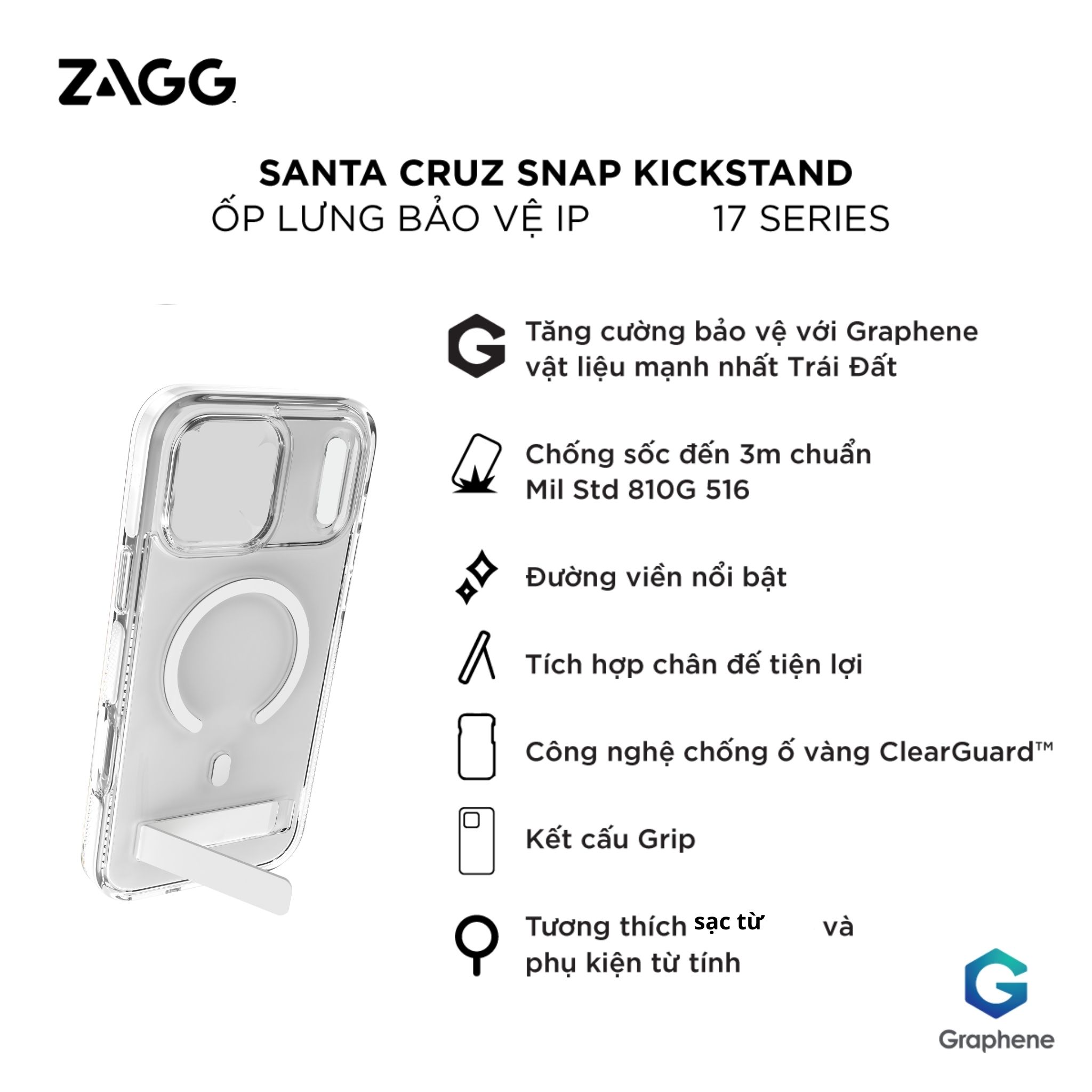 Khi tìm kiếm một chiếc ốp lưng vừa chắc chắn vừa đẹp mắt, ZAGG Santa Cruz Snap Kickstand chính là lựa chọn hoàn hảo cho iPhone 17 series. Được tăng cường với Graphene – vật liệu mạnh nhất Trái Đất – cùng khả năng chống sốc chuẩn 4m, Santa Cruz Snap mang đến sự bảo vệ toàn diện mà vẫn giữ trọn vẹn nét thanh lịch, trẻ trung cho chiếc iPhone của bạn.
