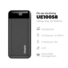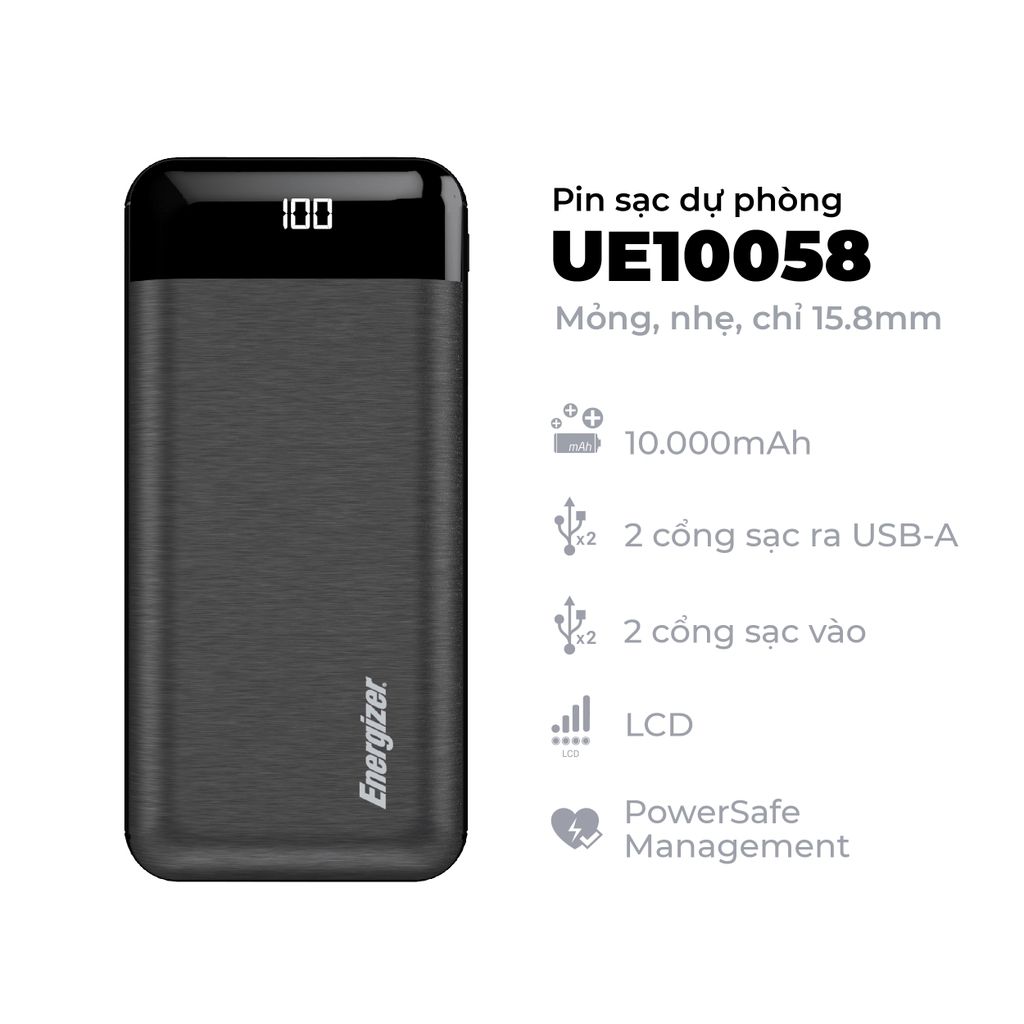 Energizer - Thương hiệu về pin sạc dự phòng chất lượng đến từ Mỹ với hơn 134 năm kinh nghiệm Đa dạng các mẫu pin về dung lượng, chuẩn sạc và các thiết kế hiện đại Tiếp tục ra mắt mẫu pin dung lượng 10000mAh vừa tầm giá cho người dùng UE10058 sở hữu thiết kế lạ mắt cùng nhiều tính năng nổi bật