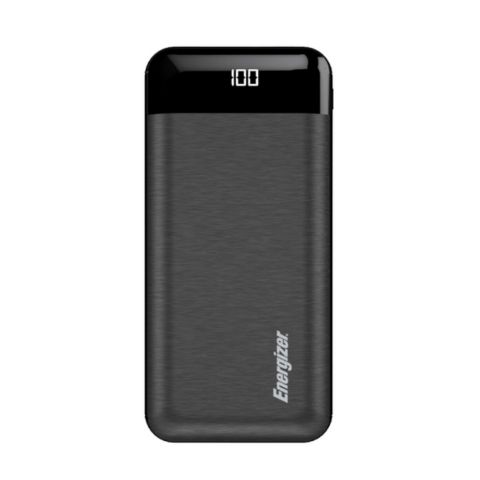 Mặt trước in logo thương hiệu Energizer cùng màn hình LCD hiển thị mức dung lượng pin và trạng thái sạc Mặt sau in các thông số kỹ thuật và thông tin thương hiệu tương ứng
