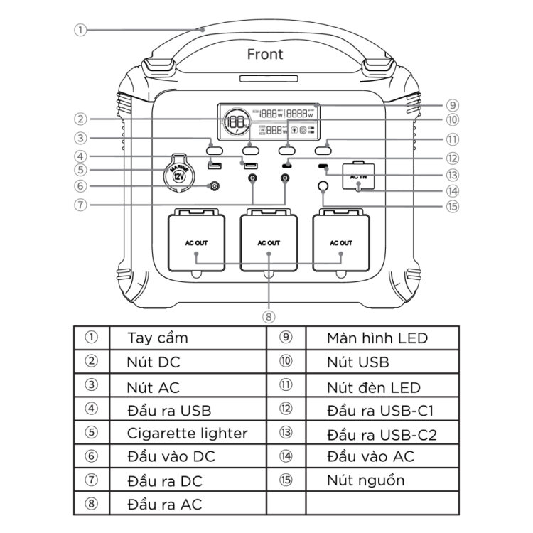 - 3 x Ổ cắm AC (chuẩn EU – chân tròn): tổng công suất lên đến 1200W (Max), sạc được nhiều thiết bị gia dụng cùng lúc.